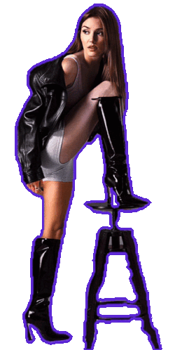 A funny sticker of a woman in a leather jacket and boots, striking a pose, embodying a humorous farting lady.