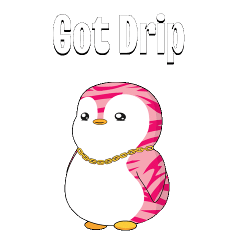 A stylish Pudgy Penguin character with pink stripes and a gold chain, showcasing its 'drip' fashion and cool attitude.