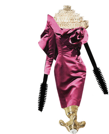 A unique fashion art sticker featuring a magenta dress with mascara wand sleeves, a golden tiered headpiece, and a faucet base.
