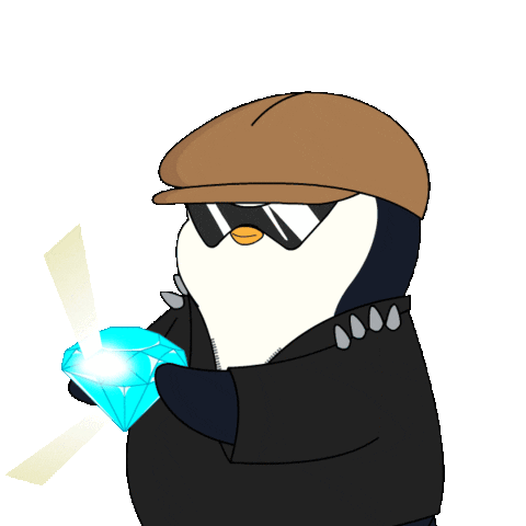 A cool Pudgy Penguin in a hat and sunglasses proudly displays a glowing, sparkling blue diamond, exuding luxury and style.