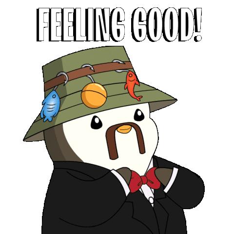 A dapper penguin in a suit, bow tie, and fishing hat proudly declares "FEELING GOOD!" in this stylish animated sticker.