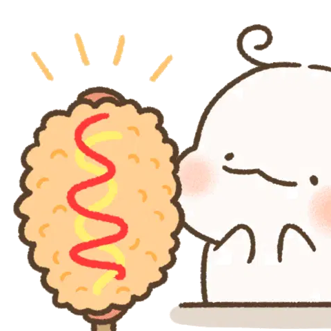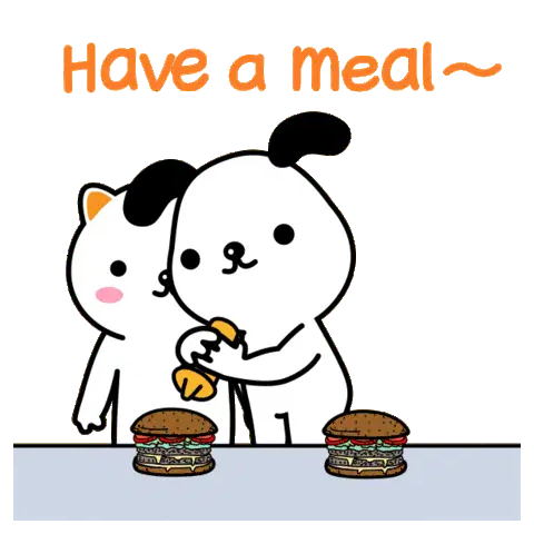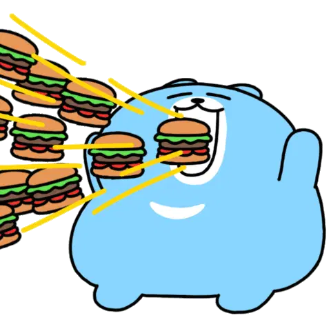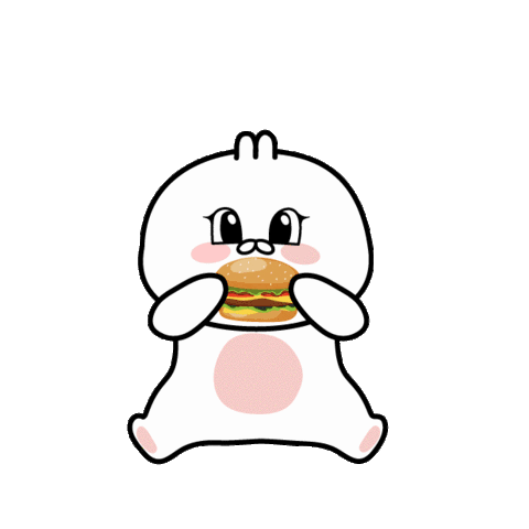 A cute white character happily eats a delicious fast food burger, showing its enjoyment and satisfaction.
