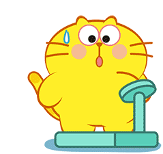 A cute, chubby yellow cartoon cat looks surprised while standing on a scale, with a sweat drop on its forehead.