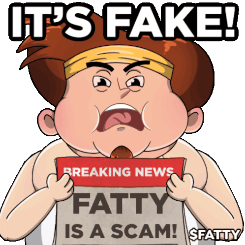 Fatty Fatbot, an angry cartoon character, yells 'Fatty is a scam' while holding a breaking news sign, expressing rage in a crypto-themed sticker.