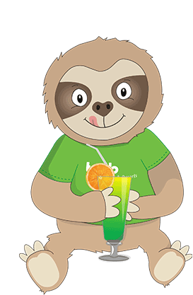 Fauli Faultier, the cartoon sloth, sips a refreshing green cocktail with an orange slice, wearing a green Travdo shirt.