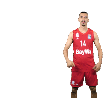 Nihad Djedovic performs a fist bump gesture in his FC Bayern Basketball jersey, showing team spirit and confidence.