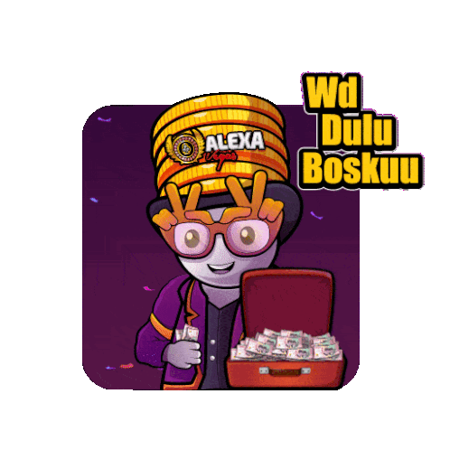 Cartoon character from Alexa Vegas celebrates a successful withdrawal, holding cash and showing a suitcase full of money with 'Wd Dulu Boskuu' text.