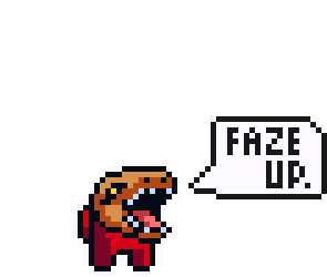 A pixel art dinosaur character, resembling an Among Us crewmate, says 'FAZE UP' in a speech bubble.