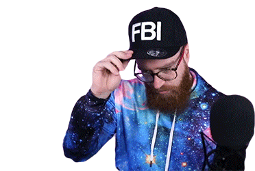 Bone, a man with a beard, wearing an FBI cap and galaxy hoodie, adjusts his cap.