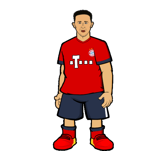 Thiago Alcantara, the FC Bayern player, celebrates with animated hand gestures in his red club jersey.
