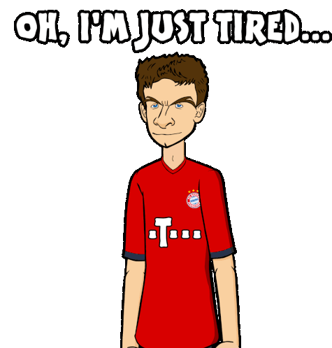 A cartoon character in an FC Bayern jersey expresses extreme tiredness with the caption 'OH, I'M JUST TIRED...'