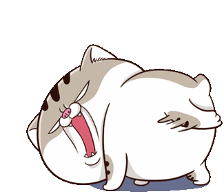 Animated sticker of Fcat yawning widely, stretching, and then settling down, looking sleepy and relaxed.