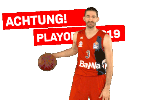 Braydon Hobbs of FCBB in a red basketball jersey, gesturing with "ACHTUNG! PLAYOFFS 2019" text overlay.