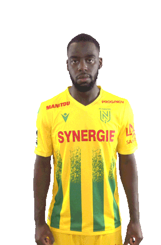Roli Pereira of FC Nantes celebrates a goal or victory, raising his fists and pointing skyward in his yellow and green jersey.
