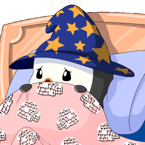 A cute cartoon penguin in a wizard hat looks anxious and scared while trying to sleep in a cozy bedroom.