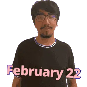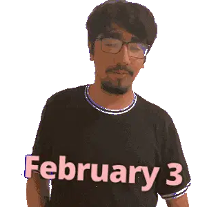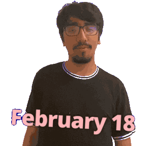 a man wearing glasses and a black shirt with february 18 written on it
