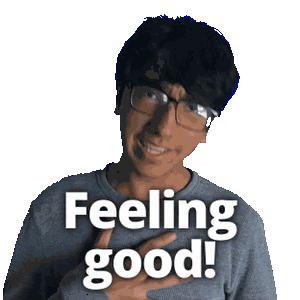 a man wearing glasses and a sweater that says feeling good on it