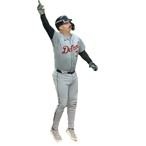 Detroit Tigers player Jake Rogers celebrates a victory, raising his arm and pointing skyward in triumph.