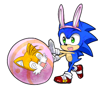 Sonic the Hedgehog and Tails celebrate Easter, with Sonic pushing a giant Easter egg containing Tails.
