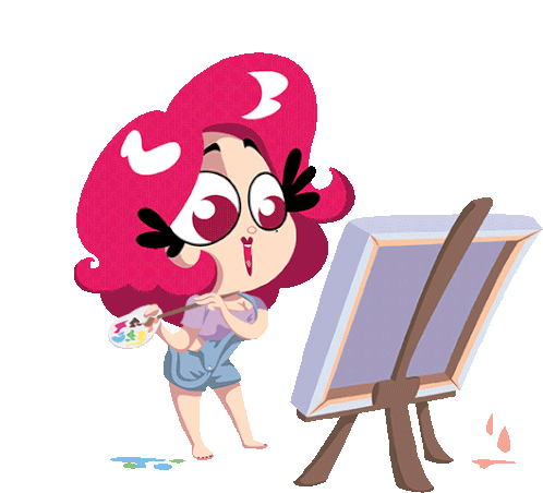 Felinia Cherry, the happy artist, joyfully paints on a canvas with her palette and brush, creating colorful art.