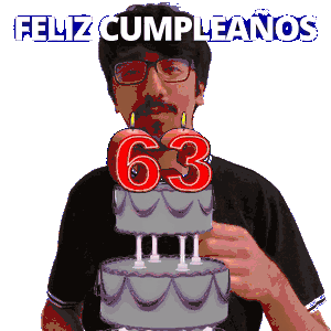 a man wearing glasses is holding a cake with the number 63 on it
