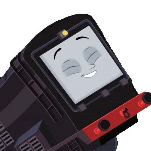 Diesel from Thomas & Friends, smiling happily with closed eyes, expressing joy and contentment.