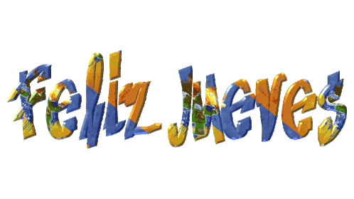 Animated sticker wishing 'Feliz Jueves' (Happy Thursday) in a vibrant 3D textured style.