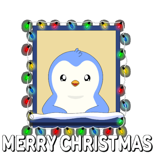 a merry christmas card with a penguin in a box surrounded by christmas lights