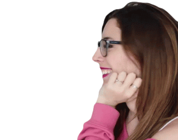 Lyna, a happy woman with glasses and bright pink lipstick, smiles broadly while resting her chin on her hand.