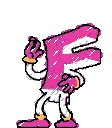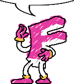 F'Ella, the pink letter F character from Block Tales, stands with arms and legs, ready to speak.
