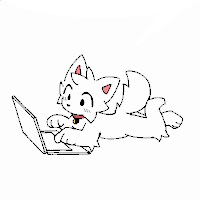 A cute femboy cat character lies down, typing on a laptop with small hearts floating nearby, showing affection.