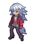 Fenrich from Disgaea 4, a pixel art character with white hair and a red jacket, strikes an angry, determined pose.