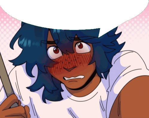 a cartoon drawing of a person with blue hair and red eyes