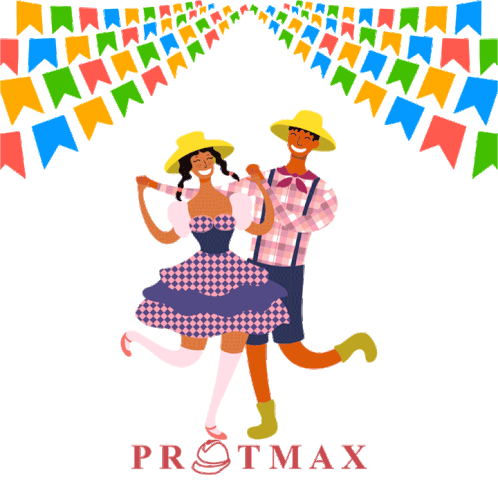 A joyful animated sticker featuring a couple dancing in traditional Festa Junina attire with a Protmax banner.
