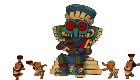 An animated Aztec God Tlaloc on a throne with small figures celebrating and offering gifts.