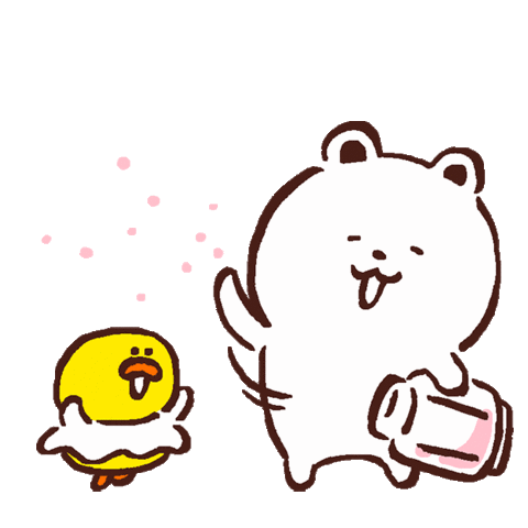 A cheerful cartoon bear and a cute chick celebrate with confetti, expressing joy and excitement.