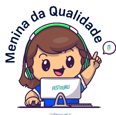 A cheerful cartoon girl with headphones, labeled 'Quality Girl', works diligently on a laptop with 'FESTQUALI' logo.