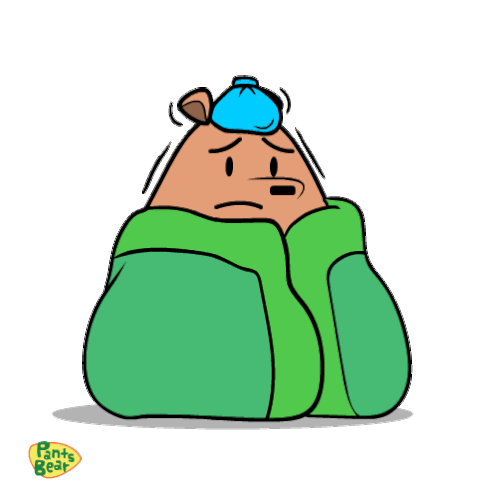 The Pants Bear character is depicted feeling unwell, wrapped in a green blanket with an ice pack on its head, indicating a fever and shivers.