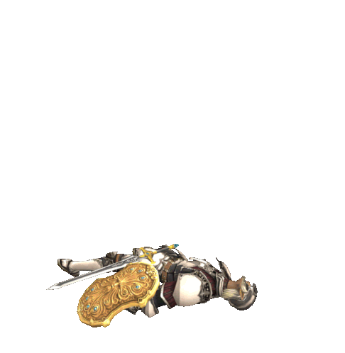 A knight from Final Fantasy XI/11 revives, getting up from the ground with sword and shield.