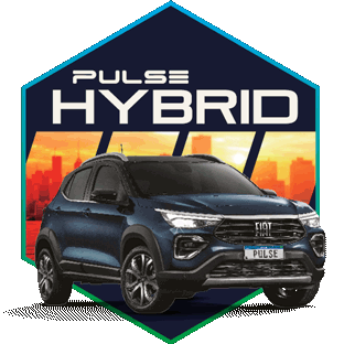 Fiat Pulse Hybrid car with 'Alta Performance' and 'Faça um Test Drive' captions, promoting its new hybrid engine.