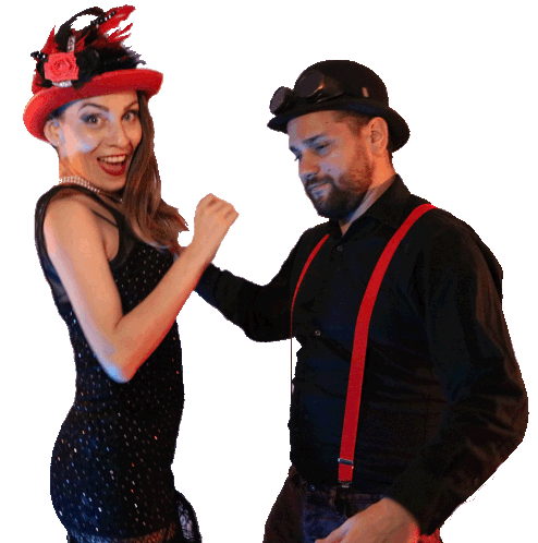 A fun animated sticker featuring a dancing clown-like character celebrating a fiesta party with music and surprise.