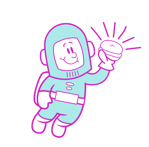 The Fifty One Burgers Astronauta character floats happily, holding up a glowing burger, ready to enjoy a cosmic meal.