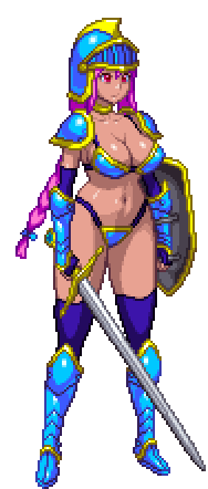 Pixel art female warrior in blue and gold bikini armor, holding a large sword and shield, ready for battle.
