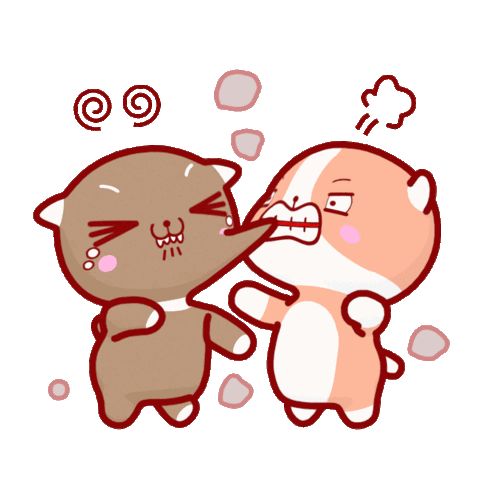 Two cute cartoon animals, one brown and one orange, engage in a playful but intense wrestling match, biting and grappling.