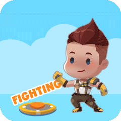 A cute cartoon character from Omega Legends cheers with a 'FIGHTING' caption, ready for action and encouragement.