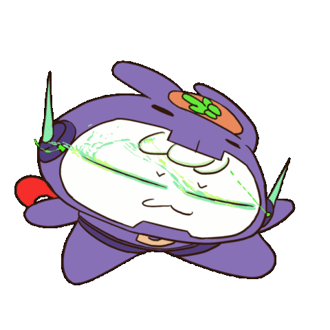 A cute purple cartoon creature, wearing headphones and a bandana, fires a powerful green laser beam from its mouth.