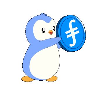 A cute blue and white Pudgy Penguin character holds a blue Filecoin crypto coin with a white 'f' symbol.