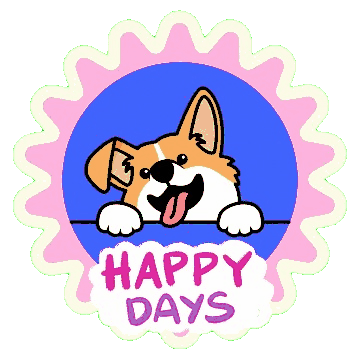 A cheerful animated sticker by Filteryouu featuring a happy corgi dog peeking out, with 'Happy Days' text and a vibrant background.