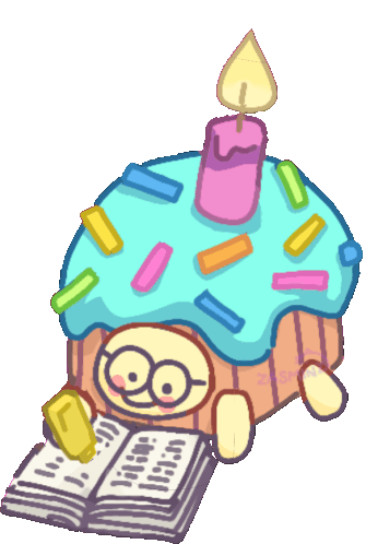 A cute character with glasses diligently studies a book, highlighting text, while sitting beside a festive cupcake with a lit candle.