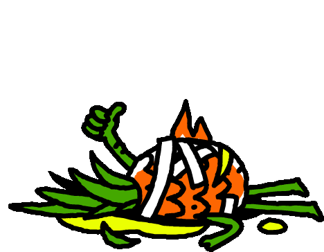 A cartoon pineapple, bandaged and on fire, gives a thumbs up, humorously conveying 'I'm fine' despite visible distress.